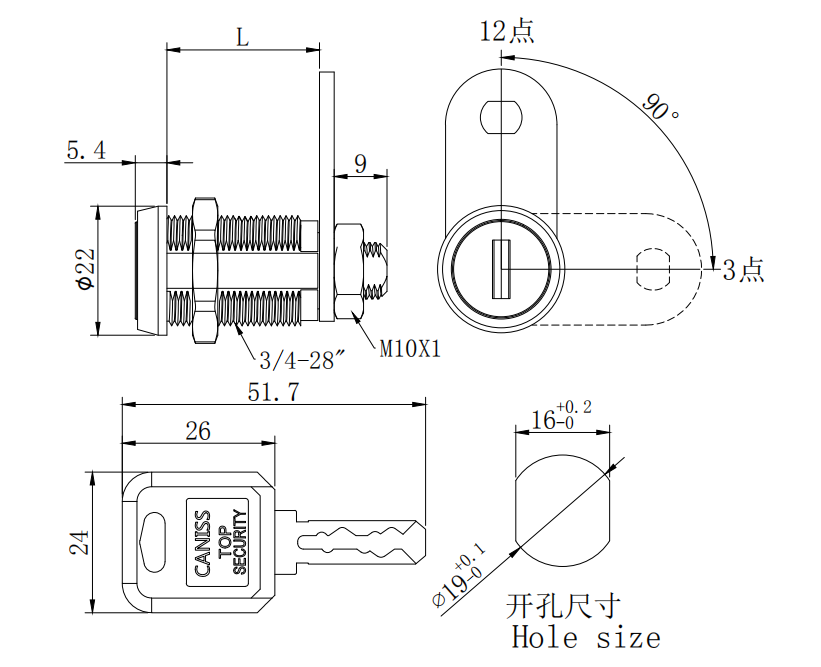 1.90°旋轉(zhuǎn)實現(xiàn)開啟或關(guān)閉。鑰匙在12點位置拔出。