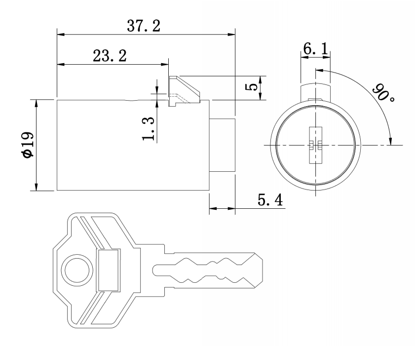 1.90°旋轉(zhuǎn)實現(xiàn)開啟或關(guān)閉,鑰匙在12點位置拔出。