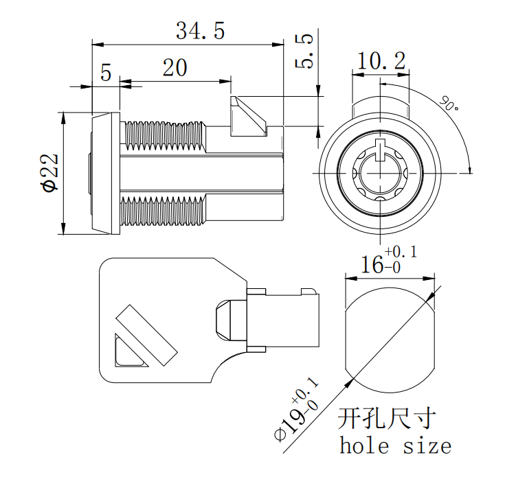1.90°旋轉(zhuǎn)實現(xiàn)開啟或關閉,鑰匙在12點位置拔出。