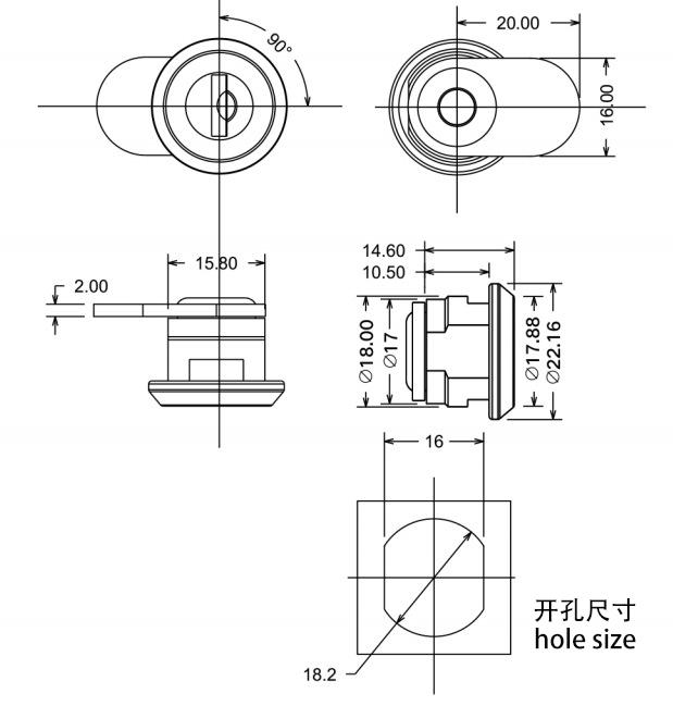 1.90°旋轉(zhuǎn)實(shí)現(xiàn)開(kāi)啟或關(guān)閉。不留匙。尾片鉚接。尾片可選可訂制。