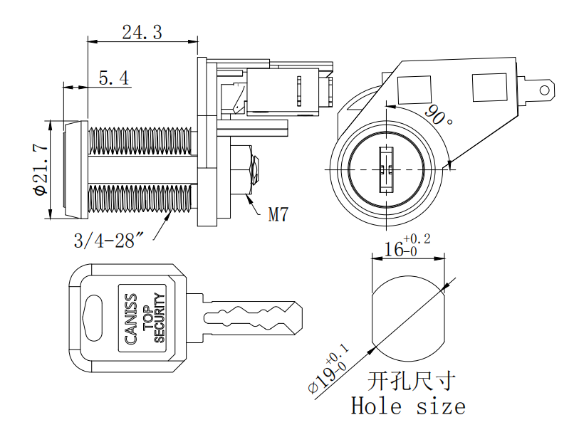 1.90°旋轉(zhuǎn)實現(xiàn)開啟或關閉。鑰匙在12點位置拔出。