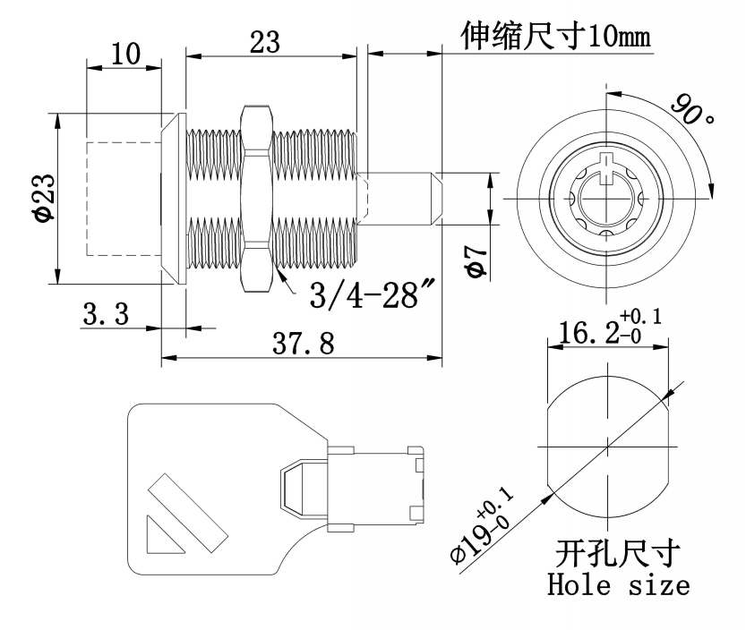 1.90°旋轉(zhuǎn)實現(xiàn)開啟,鑰匙在12點位置拔出,按下鎖頭實現(xiàn)關(guān)閉。